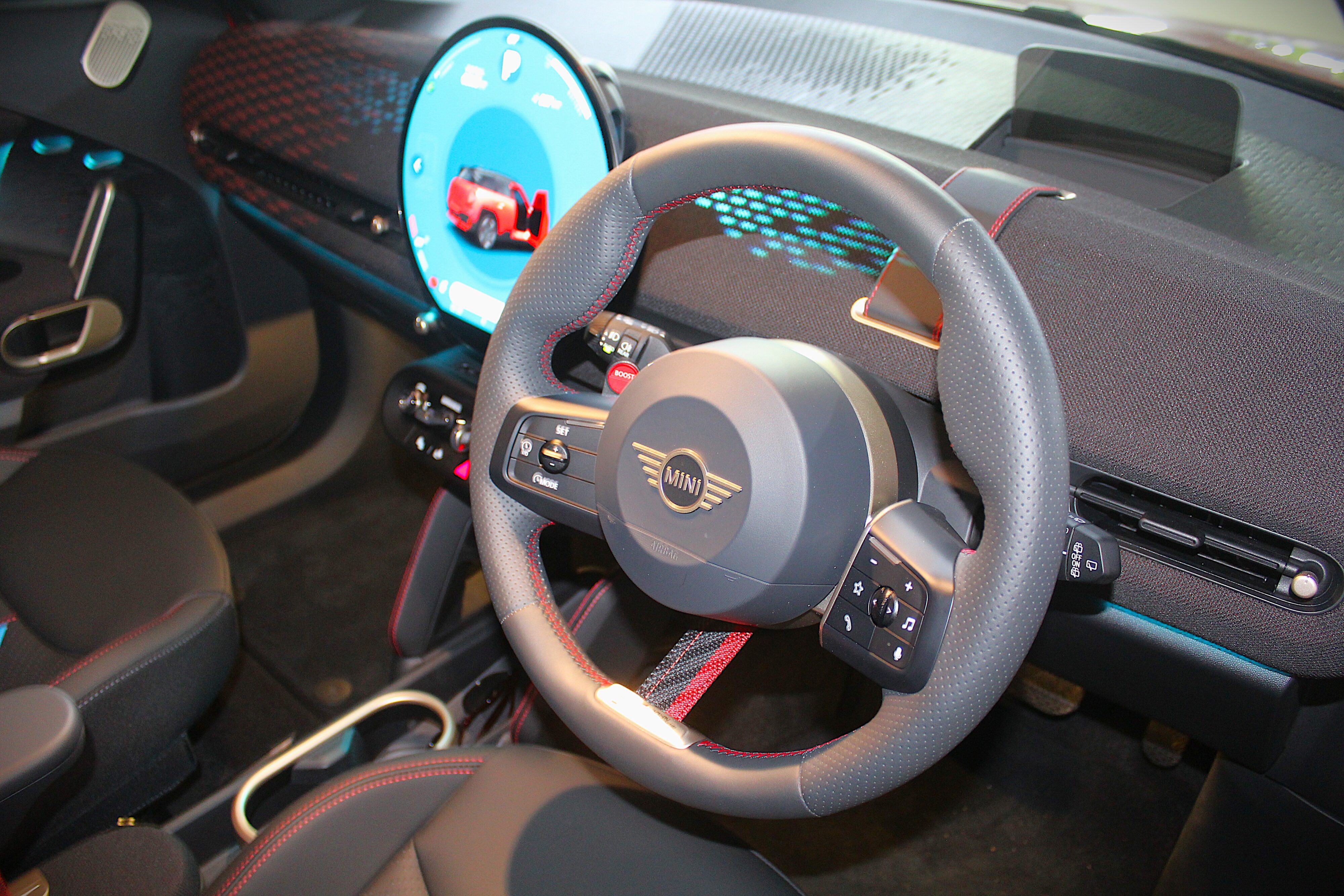 Those new LED headlights still sport the tell-tale signs of the wide-eyed Mini stare we commonly associate with Mini, be it with subtle octagonal tweaks to give the Aceman a more distinctive look. I will admit when I saw it first in pictures, I wasn’t that keen on the styling, but it does grow on you, especially clad in flamboyant John Cooper Works attire. This means a blacked-out front “grill” with JCW badging, 19-inch JCW alloy wheels, black Aceman with Mini emblem at the rear and lots of red highlights. Also, talking of red, I love the Chilli Red paint scheme which really makes it pop.
