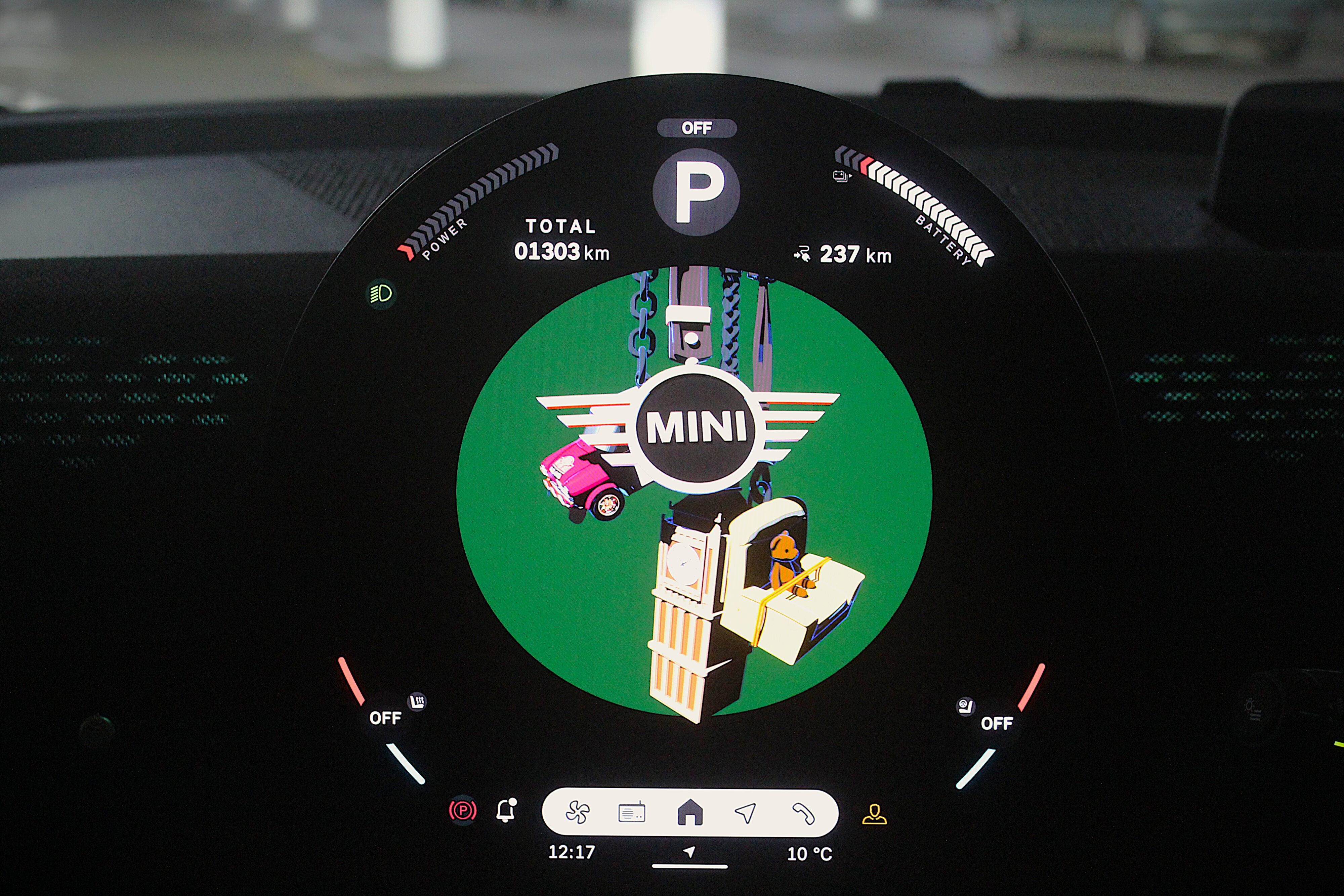 Back to the cabin, centre stage, like in all new Minis is the 240mm round OLED central touchscreen display screen. This slick screen really embraces the “mini-ness” of the brand, even allowing you to watch a fun video homage to Mini heritage featuring Monte Carlo rally winners, to Big Ben and even Mr Bean’s Mini complete with armchair on the roof.
